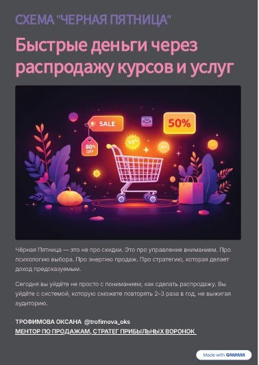 Знаете, что общего у всех провальных распродаж? Они построены на криках «СКИДКА!», а не на психологии выбора. Есть система, которая: - Работает при упавших охватах - Не выжигает аудиторию - Даёт предсказуемый доход 2-3 раза в год Я упаковала ВСЁ в готовую капсулу: 📚 МЕТОДИЧКА НА 10 ЛИСТАХ - Готовая схема «3 дня → деньги» - 20 сильных офферов под любые ниши - Психология трёх типов покупателей - Формулы цен и продуктовые связки - 12 способов создать ажиотаж 🎥 ЗАПИСЬ МАСТЕР-КЛАССА (45 МИНУТ) - Разбор ошибок, которые губят 90% распродаж - Примеры из мягких и твёрдых ниш - Пошаговый разбор динамики продаж 🎧 АУДИО-ВЕРСИЯ + МАЙНД-КАРТА - Слушайте в машине/на прогулке - Визуальная схема «Игровая Чёрная Пятница» - Можно применять БЕЗ классической распродажи ЭТО ДЛЯ ВАС, ЕСЛИ: - Уже есть продукты, но нет системных продаж - Хотите проводить распродажи без стресса - Устали от непредсказуемых доходов Это готовая система в 3-х форматах, которую можно применять уже в этом месяце. Не повторя