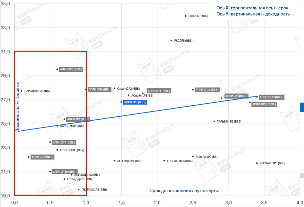 Оферты в облигациях бывают нормальными… А бывают такими (Черкизово -30%), такими (Сегежа -30%), или даже такими (ГТЛК -40%). Чтобы не получить одним днем -40% по счету мы придумали простое решение – 🗓Календарь оферт, чтобы никто не пропускал важные. Также мы ведем 🤬Black-list эмитентов, которые регулярно ставят нерыночные купоны (например 0,1% при ключевой ставке 17%). И напоминаем про то, что пора реинвестировать 😉 АПРИ не входит в Black-лист и оферта вполне рыночная. Поэтому мы пользуясь случаем оцениваем аналоги, и вспоминаем риски 👉Наши обзоры: МГКЛ, Оил Ресурс, АФК Система, Самолёт, Монополия, Евротранс и другие ISIN: RU000A10AZY5 Ставка после оферты: 24%, купон ежемесячный Следующая оферта через 1,5 года Итого: выпуск на 1,5 года с ежемесячным купоном 24% и эффективной доходностью 26,8% годовых в кредитном рейтинге ВВВ- от НКР и НРА. Обратим внимание на рейтинговые агентства, т.к. субъективно на наш взгляд у НРА и НКР зачастую более лояльные рейтинги. По карте строительных