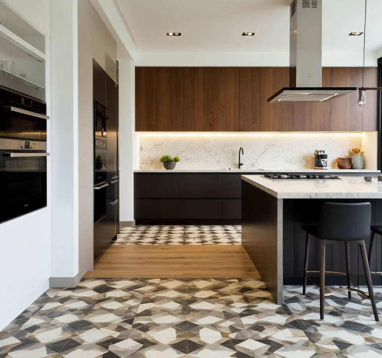 💡 Интересный приём — выложить «ковёр» из узорчатой плитки под островом или барной стойкой. Это выделит зону и добавит интерьеру индивидуальности. Диагональная укладка тоже работает на визуальное расширение пространства и отвлекает внимание от стыков.