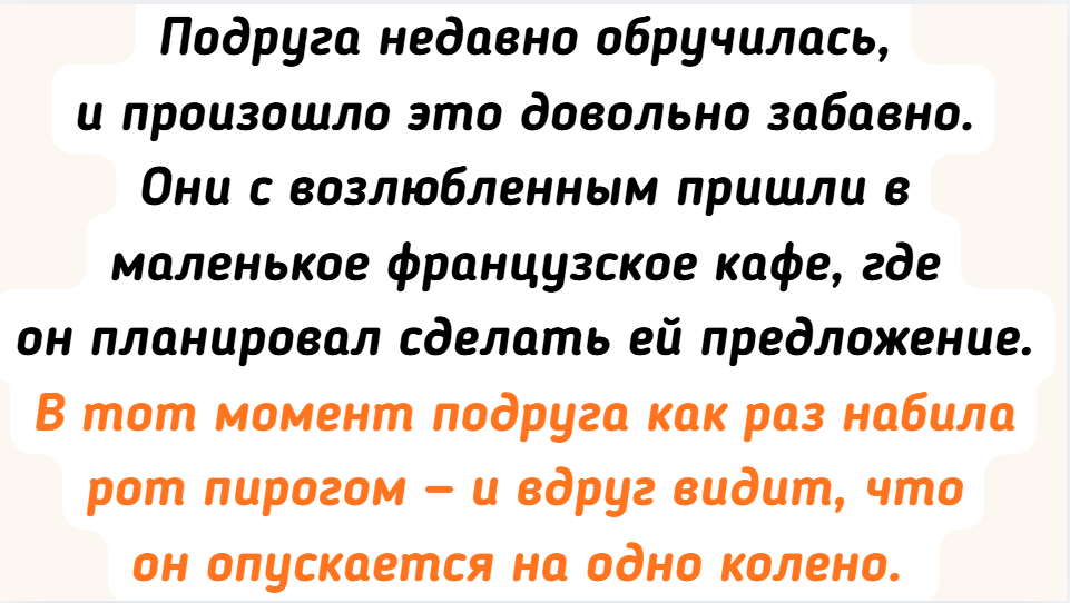 - Подруга недавно обручилась, и произошло это довольно забавно. Они с возлюбленным пришли в маленькое французское кафе, где он планировал сделать ей предложение. В тот момент подруга как раз набила рот пирогом — и вдруг видит, что он опускается на одно колено. От неожиданности она поперхнулась выпечкой... В общем, романтик явно не рассчитывал, что в его сторону полетят крошки пирога. © Unknown author