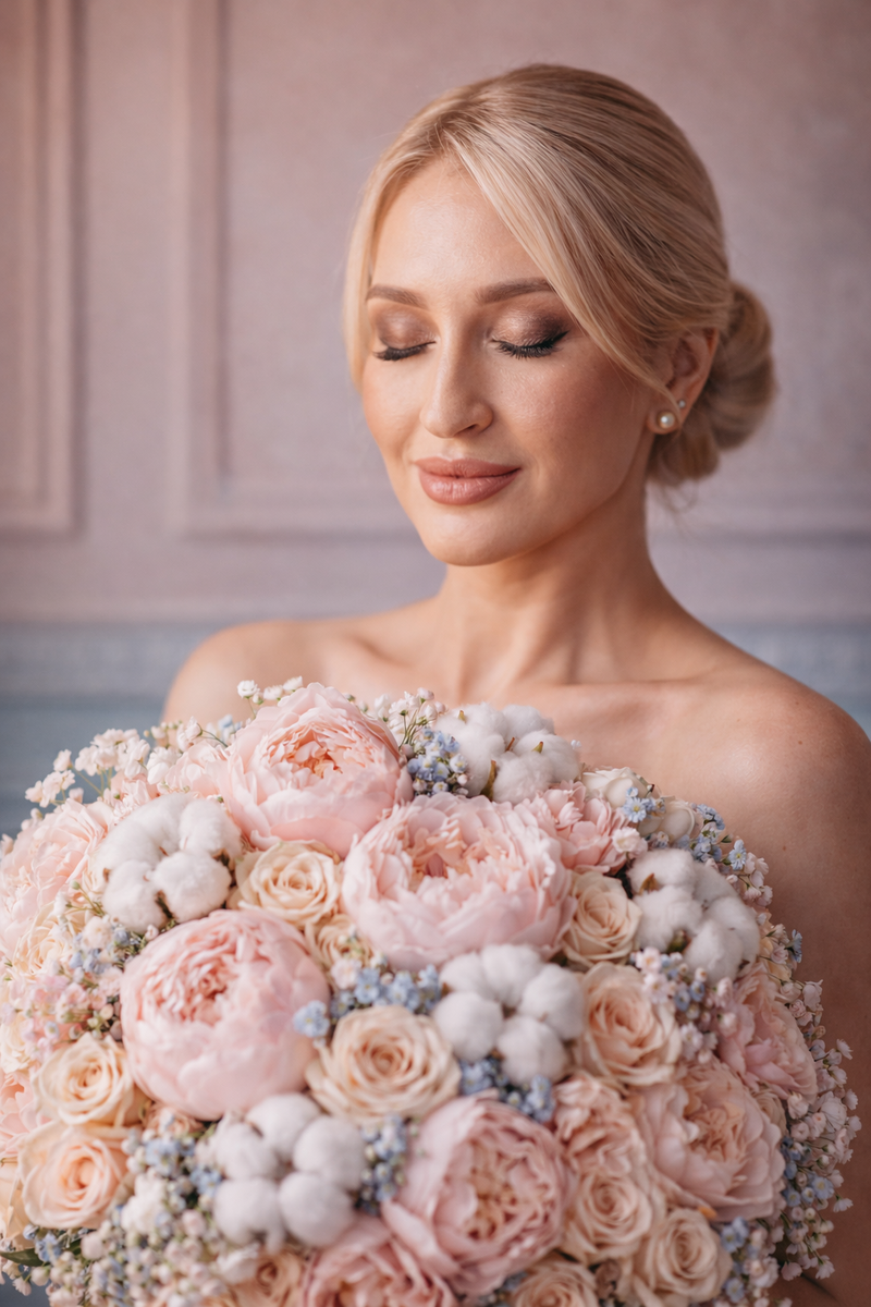 Промты можно загружать в krea, gpt, telegram-bot Фотореалистичный студийный портрет элегантной женщины c чертами лица как на фото, схожесть максимальная, глаза закрыты, выражение спокойное и расслабленное. Волосы светлые уложены в низкий гладкий пучок. На ушах минималистичные серьги-гвоздики. Женщина держит перед собой большой пышный букет из нежно-розовых пионов, кремовых кустовых роз, белых цветов хлопка и небольших голубых акцентных цветов. Букет плотный, фактурный, с мягкой пастельной палитрой. Плечи открыты, создаётся ощущение ню-портрета без акцента на одежде. Освещение мягкое направленное, тёплый солнечный свет сбоку создаёт объёмные тени и подчёркивает текстуру кожи и лепестков. Фон — интерьерная декоративная стена в пастельных оттенках: светло-розовые панели с молдингами и голубая нижняя часть стены. Стиль — high-end fashion editorial, beauty photography, ультрадетализация, мягкая глубина резкости, 85mm lens, natural skin texture, cinematic light, pastel color grading, ultra r