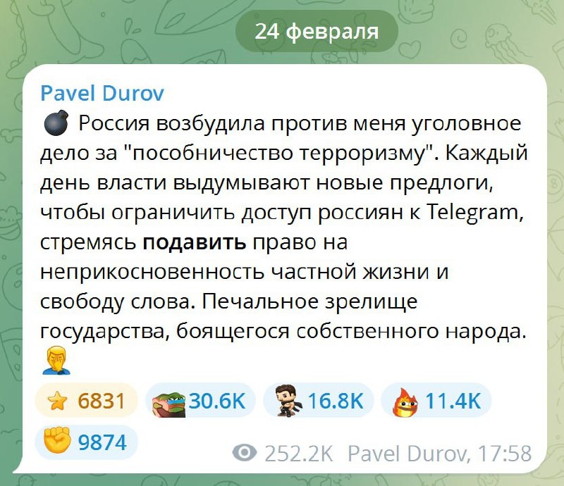 Руками водишь из Дубая, а серверы свои, хоть ты триста раз лицемерно побожись, всё равно посадил в Пиндостане. Да и про Францию не сочти за труд рассказать - как там тебя набутылили и что ты лягушатникам за выход на волю сдал. Дело прёт к блокировке ТГ. Солдат в MAX max.ru/russiasoldat