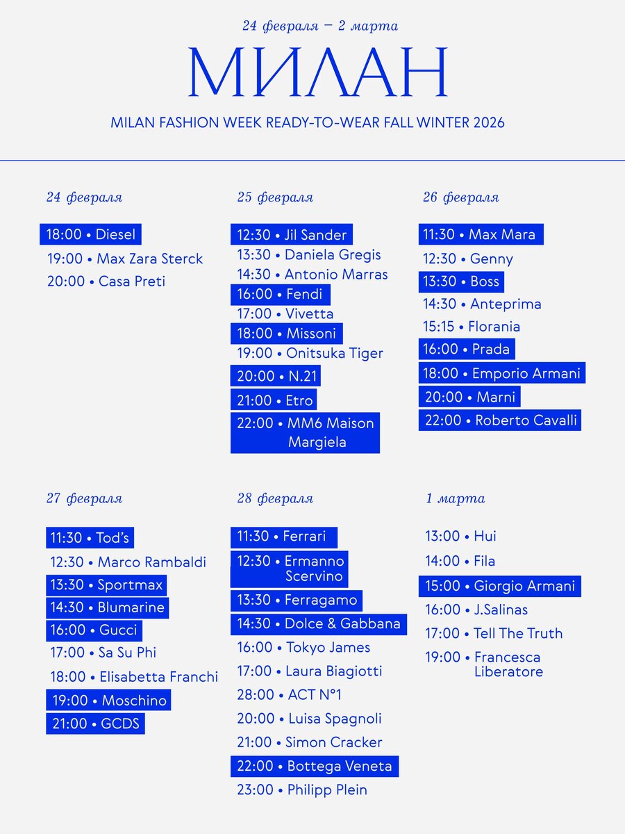 Она стартовала с шоу Diesel, за которым мы следим прямо сейчас. Другие ожидаемые показы, включая дебют Марии Грации Кьюри в Fendi, выделили на карточке и уже приготовились — смотреть, видеть и запоминать. 📌 Полное расписание миланского фэшн-марафона ищите в модном календаре The Blueprint — а все коллекции, по традиции, будут появляться в нашем разделе «Показы». 🔹The Blueprint
