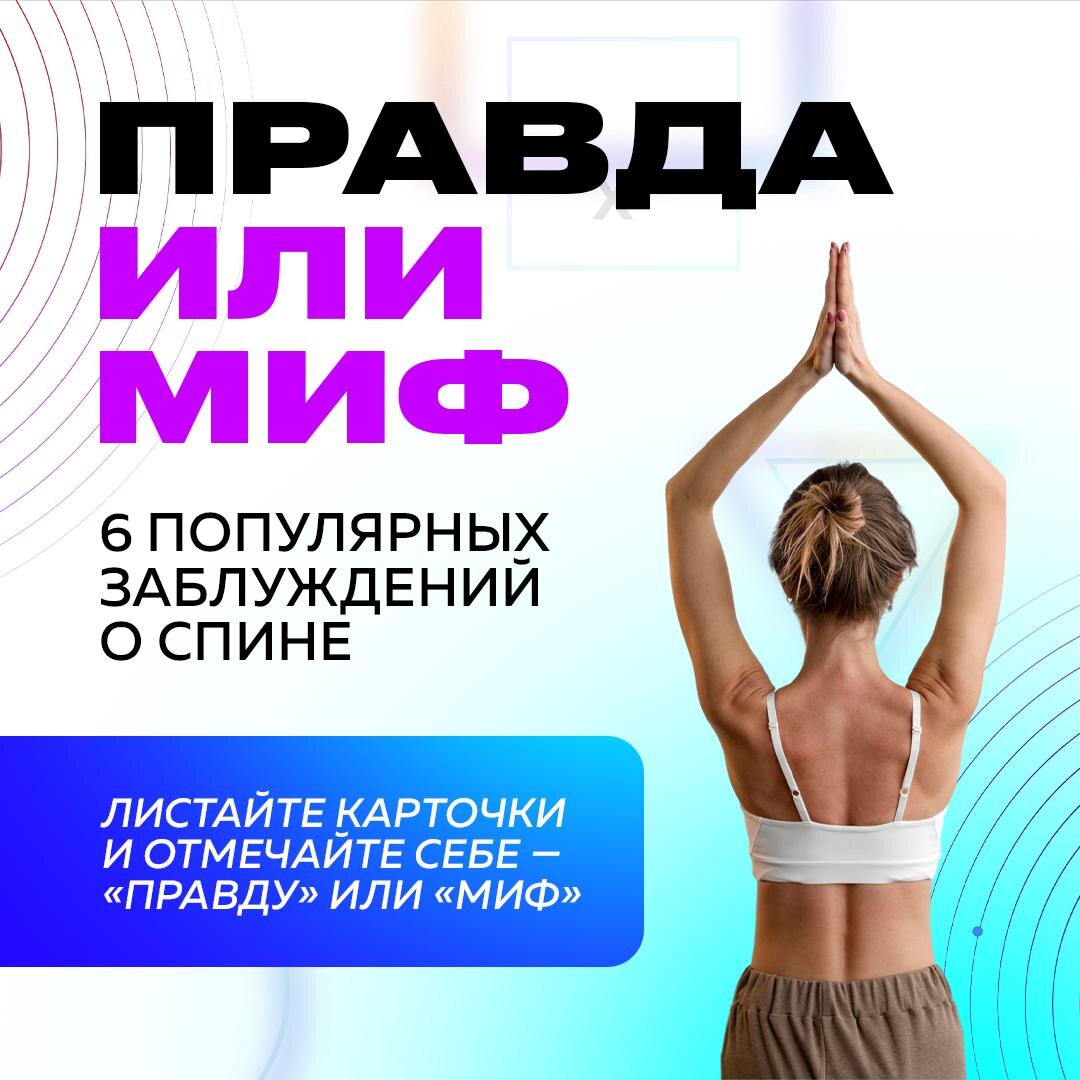 ! Пора разобраться, где правда, а где — мифы. Мы подготовили тест. Листайте карточки, отвечайте себе «правда» или «миф», а в конце читайте правильные ответы с пояснениями от наших специалистов. 👇🏻 1. ❌ МИФ. Остеохондроз — это не приговор, а состояние. С ним можно жить без боли, если убрать мышечные спазмы и восстановить биомеханику. Возраст здесь не главный — есть люди в 70 с гибкой и здоровой спиной. 2. ✅ ПРАВДА. Хруст без боли — это часто просто «лопающиеся» пузырьки газа в суставной жидкости или щелчки связок. Если нет боли, отека или скованности — он безопасен. 3. ❌ МИФ. Постельный режим полезен только в первые дни острой боли. Дальше движение необходимо. Оно восстанавливает кровоток и питание межпозвонковых дисков. Длительное лежание мышцы ослабляет. 4. ❌ МИФ. Наследуются не болезни спины, а особенности строения (например, слабость соединительной ткани, предрасположенность к грыжам). Но боль и дисбаланс — это всегда следствие образа жизни, привычек и неправильного распреде