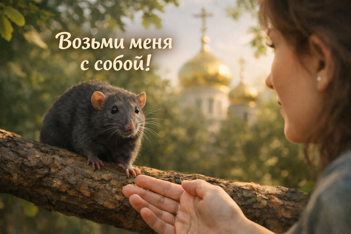 Эта история произошла поздней весной. Мы с семьей прогуливались недалеко от дома, и возле ограды храма увидели крысу, которая шла по пологой толстой ветке раскидистого дерева невысоко от земли. Я удивилась – дикие крысы обычно по деревьям не ходят, а перемещаются в людных местах как правило бегом. Эта же крыса шла, никуда не торопясь. Приглядевшись, я начала сомневаться – а действительно ли это дикая крыса? Когда-то у меня жила декоративная крыса, и эта удивительно была на нее похожа! Чтобы развеять свои сомнения, я подошла и протянула к ней руку. В этот момент мимо проходила пожилая женщина. Она увидела эту картину, и с ужасом выдохнула в полный голос: «Ох!» Она была взволнована, и ждала, что будет дальше: укусит ли меня крыса? Но крыса подошла ко мне, и залезла на руку так, будто это делала сотни раз. Стало понятно, что это декоративная крыса, которая либо случайно убежала от своих хозяев, либо они ее выпустили сами. Она смотрела на меня блестящими глазками-бусинками, и тянулась ко