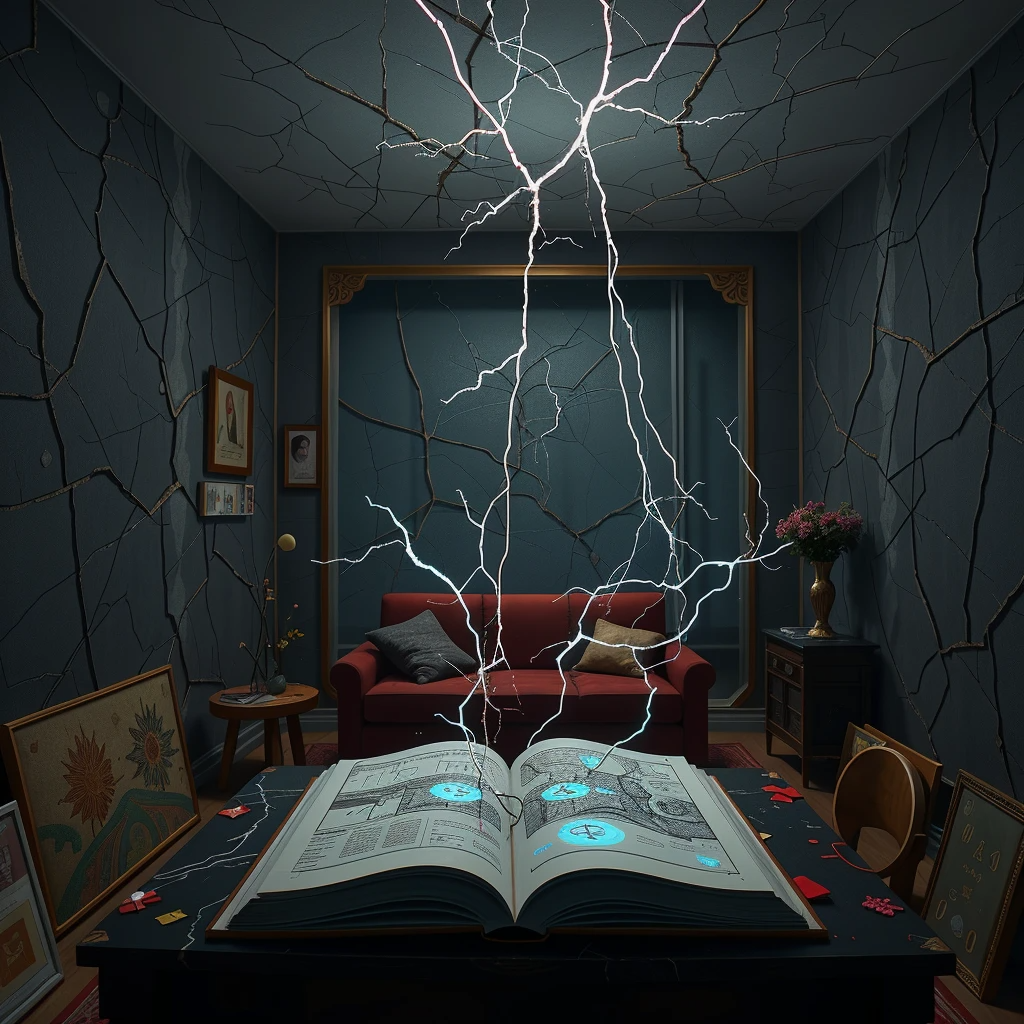 Тишина, нарушаемая шёпотом, который звучит не извне, а внутри головы. Воздух плотный, будто пропитан статическим напряжением. Каждый звук отдается эхом, искажаясь в углах комнаты.
