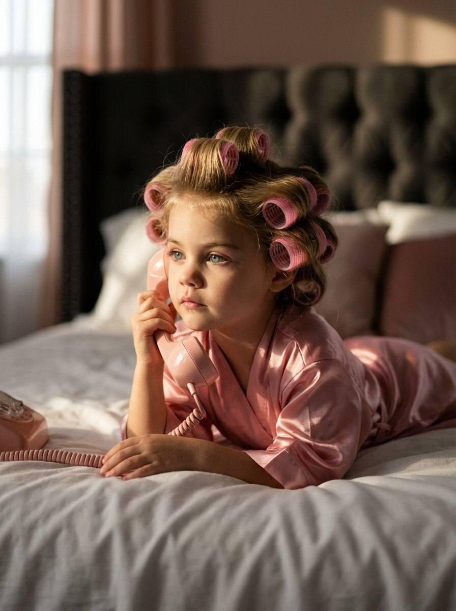 Модель: Nano Banana Сгенерировать🪄 Используя предоставленное изображение той же девушки, сохраните лицо девушки в точности таким же (СТРОГОЕ сохранение идентичности: не меняйте пропорции лица, форму/расстояние между глазами, нос, губы, линию челюсти, щеки, текстуру кожи, выражение лица; никаких улучшений, никакого старения, никакой стилизации лица). Сохраните цвет волос и челку; сохраните общее сходство 1:1. Создайте уютную кинематографическую фотореалистичную сцену в спальне: девушка лежит на мягкой белой кровати, опираясь на локти, держа у уха розовую ретро-телефонную трубку со шнуром и задумчиво смотрит в сторону (та же поза и настроение). Прическа: волосы с несколькими розовыми бигуди/накладками на липучках, соответствующими эталону; сохраните естественный размер и расположение бигуди. Одежда: шелковистый розовый атласный халат с мягкими складками и реалистичным блеском. Окружение: приглушенное уютное спальное место с темным мягким изголовьем на заднем плане, подушки позади герои