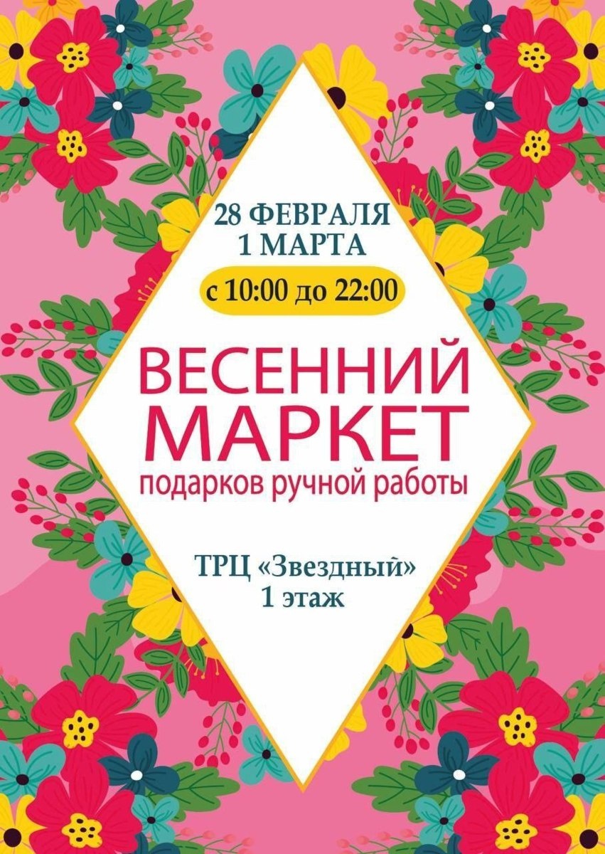 ! Приглашаем всех на весенний маркет подарков ручной работы.🎁🫶🏼 28 февраля с 10:00 до 22:00 1 марта с 10:00 до 20:00 📍ТРЦ «Звездный» 1 этаж (рядом с отделением Сбербанка) У нас вы найдете подарки к 8 марта для друзей, коллег, родных и, конечно же, для себя:картины, композиции из сухоцветов и стабилизированных цветов, стильная бижутерия, броши и украшения из меди, вязаные игрушки, натуральное мыло и косметика, спа-продукты, свечи и диффузоры. И всё это — ручной работы! 👐🏼 Мы ждём вас! Добро пожаловать! 💐