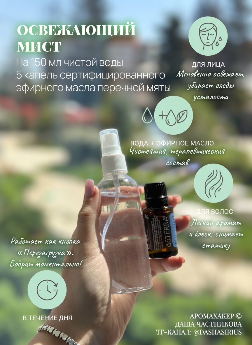 🌿 На фото я держу спрей, который сделала сама меньше, чем за минуту. Здесь чистая вода и несколько капель эфирного масла Перечной мяты dōTERRA.