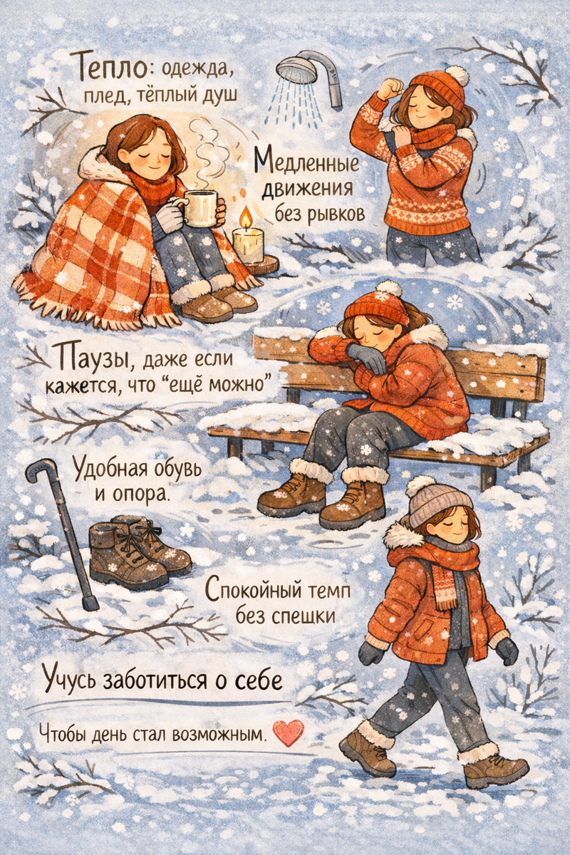 ☑️ тепло (одежда, плед, тёплый душ)