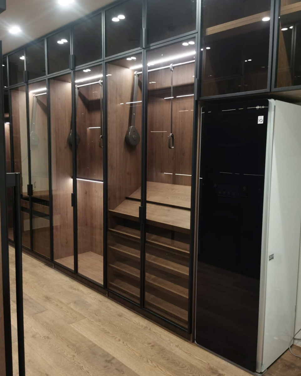 В этом проекте мы разработали и изготовили комплект мебели для гардеробной, созданной под конкретное помещение и образ жизни заказчиков. Каждый модуль спроектирован с учётом геометрии пространства, высоты потолков, расположения инженерных узлов и сценариев хранения. Корпус выполнен из ЛДСП с текстурой под натуральный шпон — тёплый древесный оттенок создаёт ощущение глубины и уюта. Фасады — стеклянные, в алюминиевом профиле чёрного матового цвета с интегрированными ручками. Такая конструкция формирует чёткую графику и визуальную лёгкость, при этом сохраняя прочность и стабильность. Наполнение полностью адаптировано под заказчика: полки для обуви, выдвижные ящики, зоны для хранения на плечиках. Установлены пантографы — удобное решение для верхних секций, обеспечивающее лёгкий доступ к одежде. Встроенная подсветка подчёркивает фактуру материалов и делает пользование гардеробной комфортным в любое время суток. Мы используем надёжную и долговечную фурнитуру, рассчитанную на ежедневную эк
