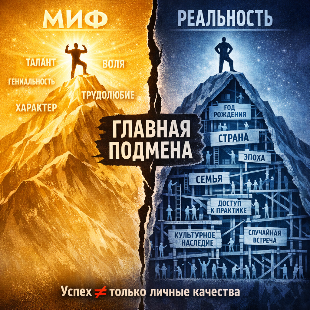 «Гении и аутсайдеры»: успех — это не нимб. Это пропуск. Есть два типа книжек про успех: Гладуэлл — из второго лагеря. И этим он бесит. Потому что он делает вещь, которую мотивационные люди не прощают: он отбирает у успеха красивую легенду. Не «гении выигрывают потому что гении», а «гении выигрывают потому что у них было время, среда, вход и возможность делать ошибки — пока другие просто выживали». Красное словцо тут такое: талант без доступа к площадке, людям и правилам игры — это дорогая мебель на складе. Вроде вещь, а в интерьере её никогда не увидят. Мы любим объяснять чужой успех так, чтобы он выглядел морально справедливым: он заслужил, она пахала, он умный, она трудяга. Это не анализ. Это культурный комфорт. Гладуэлл меняет вопрос: не «почему он такой крутой?», а «какие условия сделали его крутость конвертируемой в результат?». И вот тут начинается взрослая жизнь. Потому что выясняется: Все любят мем: «10 000 часов — и ты мастер». Но в книге важнее не число. Важнее кто дал тебе в