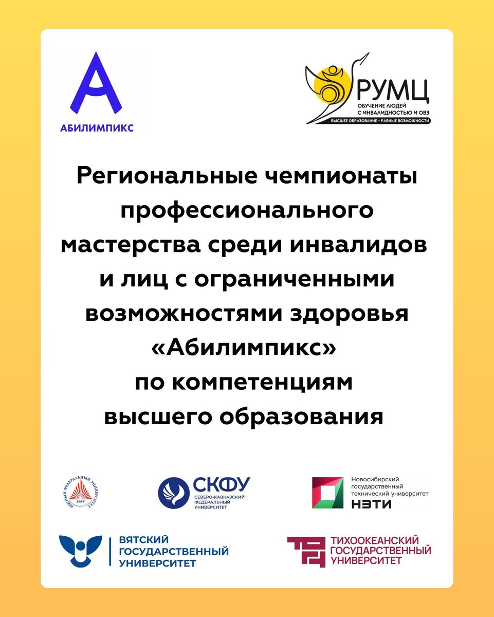 Цель чемпионата – расширить возможности и создать условия для максимального вовлечения студентов вузов с инвалидностью и ограничениями здоровья в движение «Абилимпикс». Задачи включают повышение мотивации к профессиональному развитию и трудоустройству, развитие конкурентоспособности, надпрофессиональных навыков, взаимодействие с работодателями и продвижение современных форматов профориентации. Операторами чемпионата в 2026 году определены ресурсные учебно-методические центры пяти вузов: 1️⃣ Южный федеральный университет ( 🟡 РУМЦ ЮФУ) 2️⃣ Северо-Кавказский федеральный университет ( 🟡 РУМЦ СКФУ) 3️⃣ Новосибирский государственный технический университет ( 🟡 РУМЦ НГТУ НЭТИ) 4️⃣ Вятский государственный университет ( 👀 РУМЦ ВятГУ) 5️⃣ Тихоокеанский государственный университет ( 🟡 РУМЦ ТОГУ) 🔜 Ключевые сроки регистрации и проведения (время по мск): ЮФУ: регистрация до 23:59 3 марта 2026 года по ссылке, проведение 16–21 марта. СКФУ: регистрация до 23:59 20 марта 2026 года по ссылке, п