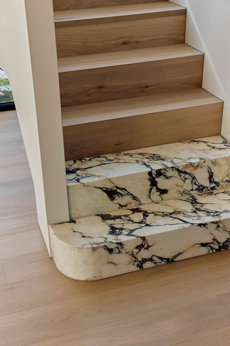 2026 год окончательно закрепляет сдвиг от «картинки ради картинки» к архитектурной глубине и материальной честности. Отделка больше не служит фоном — она становится главным инструментом формирования пространства. В фокусе — натуральный камень, крупный формат, тактильные поверхности, интеграция инженерии и сценарная планировка. Тренды 2026 года — это не быстрые визуальные эффекты, а продуманные архитектурные приёмы, рассчитанные на долгий цикл жизни пространства. Облицовка первых ступеней мрамором — это приём «переходной зоны». Нижний марш испытывает максимальную нагрузку, поэтому камень здесь одновременно дает функциональность и статус. Визуально лестница приобретает архитектурную тяжесть и ощущение монументальности, особенно если мрамор идет в плинтус или портал. Это отсылка к классической европейской парадной архитектуре. Когда решётка конвектора выполнена из того же материала, что и напольное покрытие (камень, латунная вставка, окрашенный металл в тон), инженерия перестаёт «кричать»