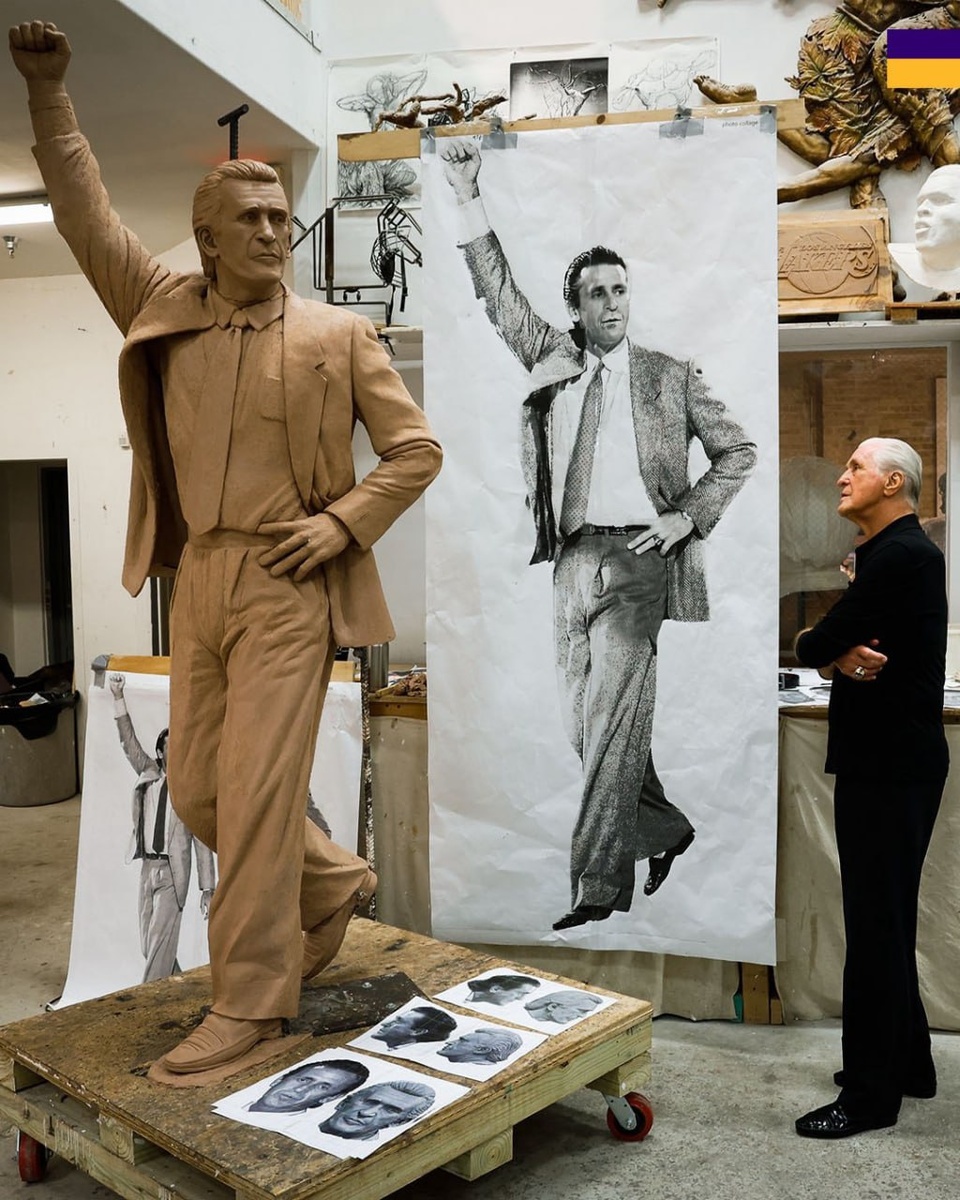 Пэт Райли у прототипа памятника, который ему недавно установили рядом с ареной Лос Анджелес Лэйкерс