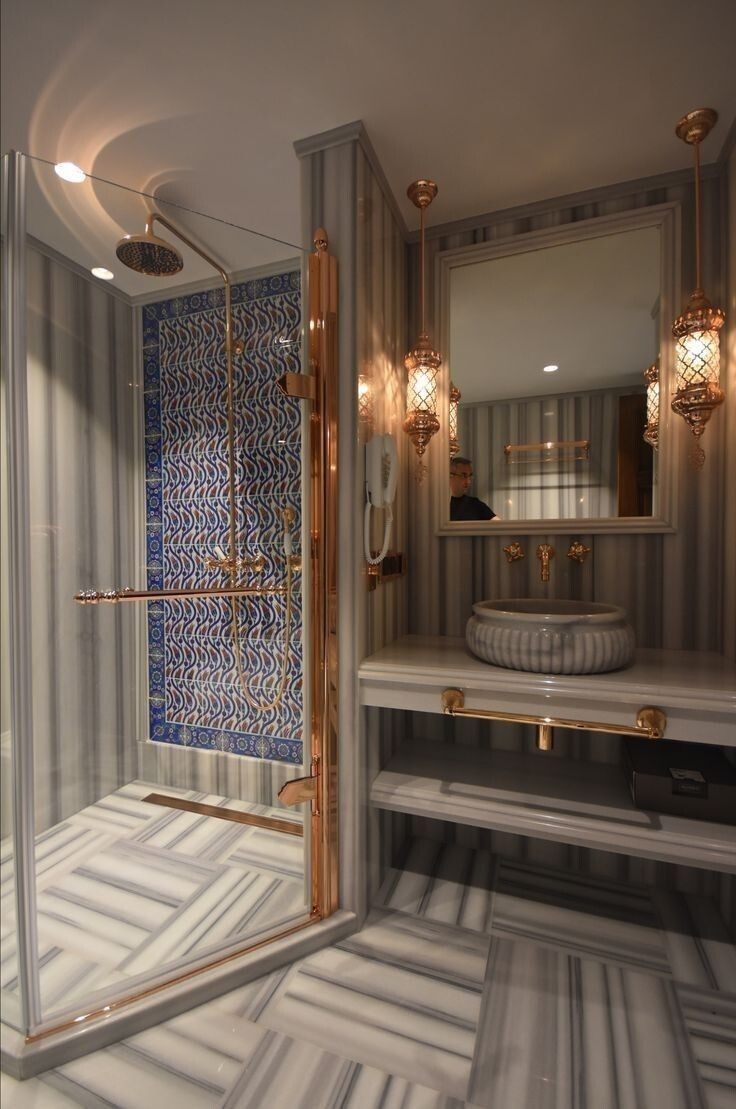 Современные ванные всё чаще проектируются как камерные интерьерные сцены. Плитка, мрамор, панно и обои становятся носителями художественного языка. Ниже — разбор ключевых декоративных приёмов. Декоративная плитка с восточным орнаментом формирует «зону внутри зоны»: душевая читается как отдельная архитектурная вставка, почти как керамическая ниша-хаммам. Орнамент концентрируется внутри кабины, создавая эффект ковра на стене, тогда как окружающие плоскости остаются нейтральными. Натуральный мрамор вокруг усиливает контраст — сложный рисунок орнамента работает на фоне спокойной каменной текстуры. Это приём акцентной локализации декора. Это классическая европейская система начала XX века — «поле + рамка». Основная мелкоформатная плитка формирует монолитную цветовую плоскость, а бордюр по периметру выполняет роль керамического карниза. Такой подход дисциплинирует геометрию помещения, подчёркивает ниши и углы. Пространство выглядит завершённым и структурированным, как в исторических апартаме
