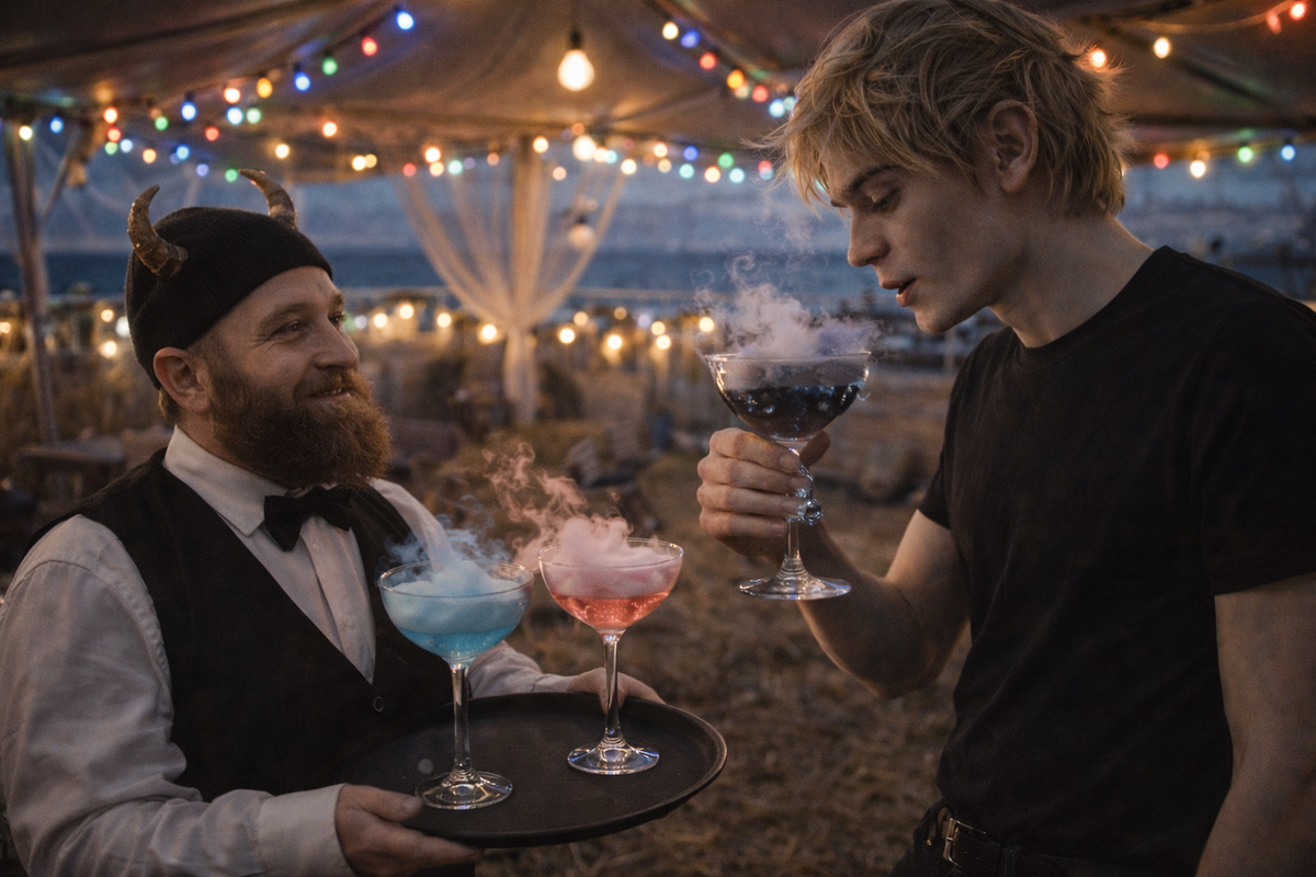 Настала пятница. Он прибыл по указанному адресу. На плоской крыше был натянут шатёр, пол посыпан песком, внутри горели разноцветные гирлянды, пахло морем и чем-то ещё, неуловимо знакомым... сеном?? К нему тут же подошёл официант с подносом. На подносе стояли бокалы, над которыми клубились облачка. Одно было голубым, другое - серым с чёрными прожилками, третье - розовое, похожее на зефир. Лёха схватил бокал с серым облаком, принюхался, пахло грозой. - Что это? - недоверчиво поинтересовался он у официанта.