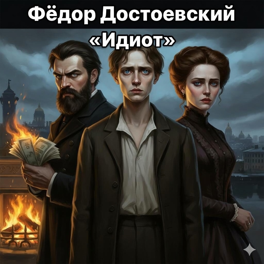 ВСЕ КНИГИ МИРА ЗА МИНУТУ Фёдор Достоевский — «Идиот» Суть в одной фразе: Трагическая история о том, как появление искреннего, милосердного и «совершенно прекрасного» человека в обществе, одержимом деньгами и страстями, приводит к катастрофе для всех героев. Мир и герои: Лихорадочный, нервный Петербург XIX века. В центре — князь Мышкин, человек святой простоты и доброты, которого окружающие за отсутствие эгоизма и болезни называют «идиотом». Его жизнь оказывается зажата между двумя женщинами: гордой, израненной Настасьей Филипповной и чистой Аглаей Епанчиной. Сюжетный драйв: * Возвращение: Князь Мышкин возвращается из Швейцарии, где лечился от эпилепсии. Он беден, но открыт миру. В первый же день он оказывается втянут в водоворот интриг петербургского света. * Роковая страсть: Мышкин видит портрет Настасьи Филипповны и читает в её глазах безмерное страдание. Он хочет спасти её своей жалостью и любовью, но сталкивается с Парфеном Рогожиным — богачом, чья любовь к ней граничит с безумием