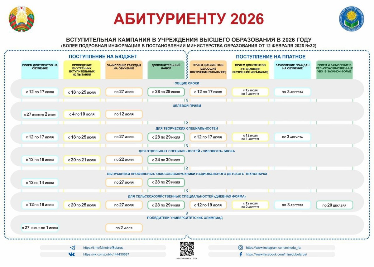 ⏩Публикуем сроки вступительной кампании в учреждения высшего образования на 2026 год! 📌Сохраняйте инфографику, чтобы не пропустить важные даты: ✅Приём документов ✅Вступительные испытания ✅Зачисление на бюджет и платное 📋Подробная информация — в постановлении Министерства образования от 12.02.2026 №32 @Пинский Вестник 📱Ютуб 📱ВК 📱ИНСТАГРАМ 📱ОК 📱ФЕЙСБУК 📱ТИК ТОК Прислать новость