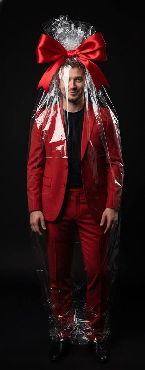 Сгенерировать фото🪄 Студийная художественная фотография мужчины в полный рост на глубоком черном фоне. Не меняя черты лица. Мужчина с легкой бородкой и улыбкой одет в элегантный ярко-красный классический костюм поверх черной футболки. Самая необычная деталь — он полностью упакован в прозрачную, блестящую целлофановую обертку, имитирующую подарочную упаковку. Сверху над головой пакет завязан пышным красным атласным бантом. Освещение контрастное, создающее выразительные блики на пластиковой пленке, что подчеркивает текстуру упаковки. Композиция концептуальная, ироничная, в стиле модной журнальной съемки.