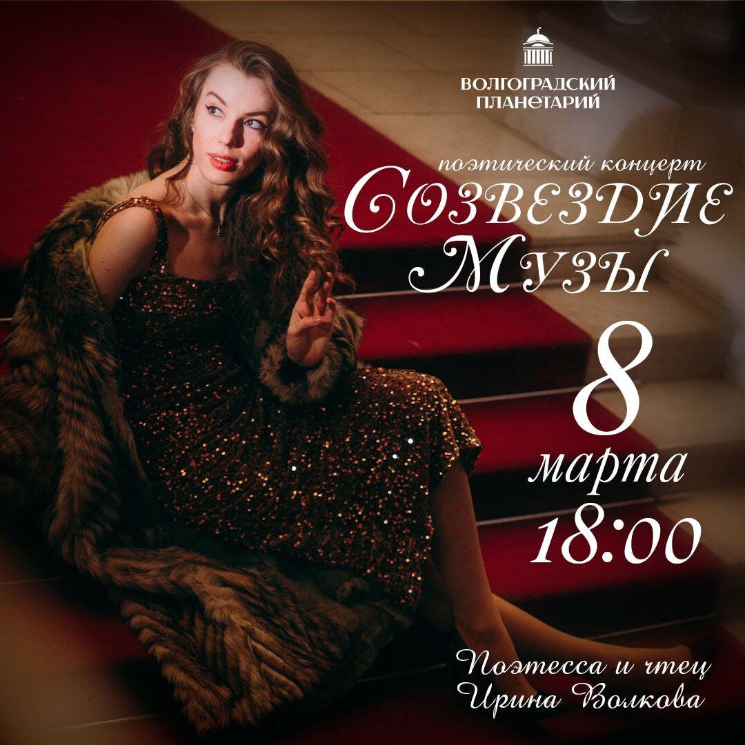 .......................................... СОЗВЕЗДИЕ МУЗЫ #Концерт_В_планетарии .......................................... ⠀ ⠀ 💐 8 марта мы совершим музыкально-поэтическое путешествие по созвездиям чувств, мыслей и судеб великих поэтесс. Их голоса, как звезды, которые, даже угаснув, продолжают доносить до нас свой свет. ⠀ В программе — звездная россыпь имен: • Марина Цветаева — стихия страсти и одиночества. • Анна Ахматова — величавое эхо эпохи. • Белла Ахмадулина — изысканная мелодия бытия. • Вероника Тушнова — нежная исповедь сердца. • Зинаида Гиппиус — философская глубина и тайна. • Тэффи — блеск ума и улыбка сквозь слезы. ⠀ ⠀ 💫 Ирина Волкова, чей голос завораживает тысячи людей, вместе с музыкантами симфонического оркестра создадут невероятное пространство, где каждая строчка станет созвездием, а каждое чувство — планетой в бездонном космосе человеческой души. ⠀ Гигантский купол планетария, на котором оживут визуальные образы, навеянные поэзией, — создадут эффект полного погружен