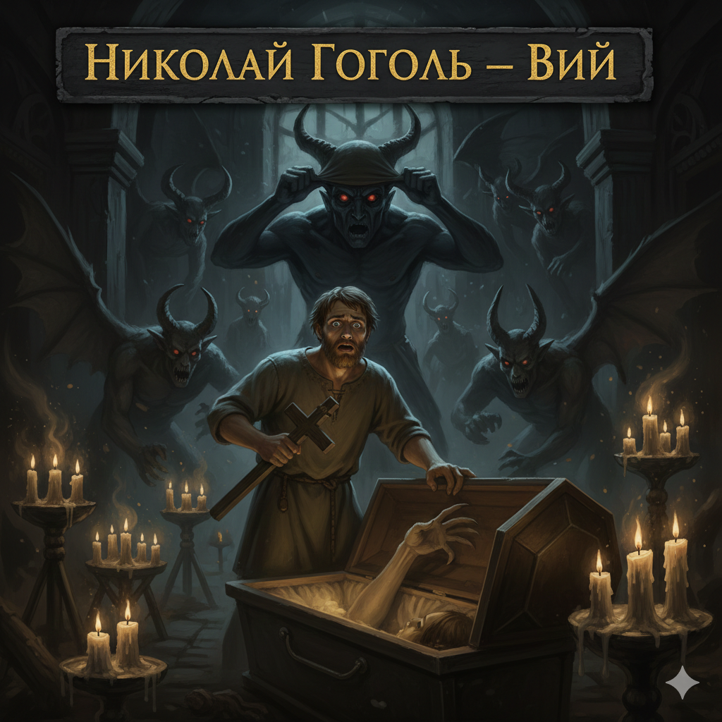 ВСЕ КНИГИ МИРА ЗА МИНУТУ Николай Гоголь — «Вий» Суть в одной фразе: Страшная быль о том, как юный бурсак Хома Брут столкнулся с силами тьмы, три ночи отпевая ведьму, и не смог спастись от взгляда чудовищного Вия. Мир и герои: Мистическая Малороссия, где реальность переплетается с народными поверьями. В центре — Хома Брут, студент Киевской бурсы, веселый и бесшабашный философ, оказавшийся втянутым в борьбу с нечистой силой. Сюжетный драйв: * Роковая встреча: Возвращаясь с каникул, Хома со товарищи ночует на хуторе у старухи. Ночью старуха оказывается ведьмой, оседлывает Хому и скачет на нем по полям. Хома, едва не погибнув, из последних сил избивает её до смерти. * Повеление сотника: Прибыв в бурсу, Хома получает неожиданное распоряжение: отправиться в отдаленную деревню и отпевать три ночи кряду умершую панночку. И каково же его потрясение, когда он узнает в ней ту самую ведьму, которую он убил. * Борьба с тьмой: Каждую ночь Хома запирается в церкви с гробом панночки. В первую ночь вед