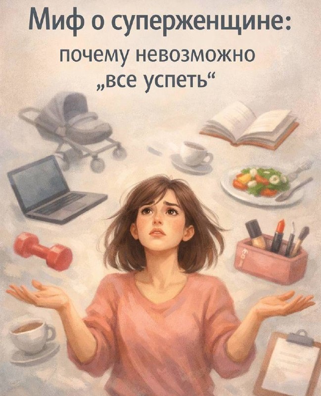 » Вы когда-нибудь ловили себя на мысли, что должны быть везде и сразу? Успевать строить карьеру, воспитывать детей, поддерживать идеальный порядок в доме, выглядеть безупречно, заниматься саморазвитием и при этом оставаться спокойной, улыбчивой и благодарной за всё это «счастье»? ✅ Это и есть тот самый миф о суперженщине - образ, который давно стал негласным стандартом, но редко кто задумывается, откуда он взялся и какую цену мы платим за попытки ему соответствовать. 📌 Идеал «успешной мамы-карьеристки» сформировался не сам по себе. В разные эпохи общество предъявляло женщинам разные требования: то призывало к полному посвящению себя семье, то к профессиональной самореализации. 🔘Сегодня, кажется, сошлись оба полюса: от женщины ждут, что она будет и отличной матерью, и ценным сотрудником, и хранительницей уюта, и при этом не потеряет себя, найдёт время на спорт, хобби, уход за собой. Этот собирательный образ тиражируется в медиа, рекламе, глянцевых журналах и постепенно превращает