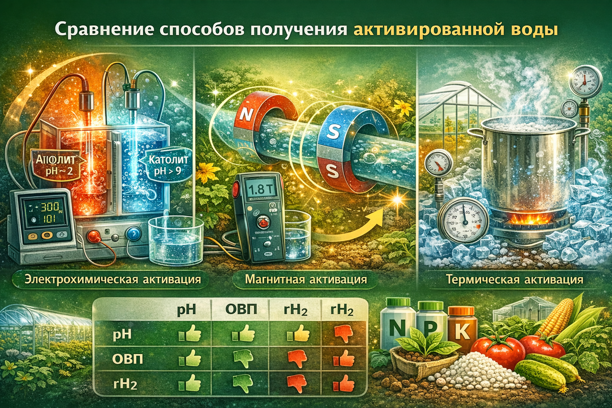 каким способом целесообразнее получать активированную воду для растениеводства? Рассмотрим основные методы. Наиболее распространённый и изученный способ. : вода подвергается электролизу в устройстве с анодом и катодом, разделёнными мембраной. В результате образуются две фракции:Суть метода подробно описана ранееПродуктивное растениеводство АВ… Для профессионального растениеводства данный метод является наиболее управляемым. Метод основан на пропускании воды через магнитное поле. Предполагается, что изменяется структура водных кластеров, уменьшается поверхностное натяжение