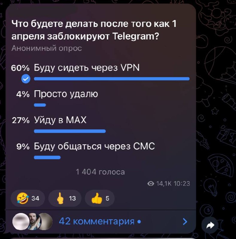 )) Пожалуй, за последние 1,5 недели это один из самых волнующих поводов (ну помимо Додособаки 😁) Один блогер спросил у своей аудитории про ее планы после блокировки ТГ. Как видите, несмотря на серьезные ограничения, большинство не собираются сдаваться. Но при этом уже почти 30% спокойно переносят переезд. Думаю, в ближайшее время эта цифра увеличится, ведь в Максе уже внедряют предложения от которых гражданам сложно отказаться. То есть они создают конкуренцию нынешним соцсетям своими УТП. Что уже известно о преимуществах: ➡️ внедрили акцию «Культура по МАХимуму» — льготные категории граждан могут бесплатно или со скидкой посещать театры, музеи, выставки и тд. ➡️ сделали возможность подтверждения возраста, личности через профиль в Максе ➡️ разрабатывают рекламный кабинет Уверена, что в ближайшее время появится господдержка блогеров которые развивают свои каналы в Максе, это лишь вопрос времени. 💔 Лично для меня это все эти переезды и обнуления так же некомфортны, как и для больш