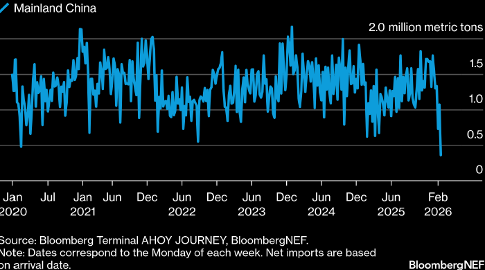Bloomberg объясняет это празднованием в стране Китайского нового года. Чистый недельный импорт СПГ материковым Китаем (млн тонн). Данные: BloombergNEF, источник: Bloomberg На неделе с 16 по 22 февраля поставки сжиженного природного газа (СПГ) в Северо-восточную Азию обвалились более чем на 1,2 млн тонн н/н, пишет Bloomberg со ссылкой на данные по движению судов. Основная часть этого снижения была обусловлена сокращением поставок в Китай на 0,7 млн тонн н/н на фоне празднования в стране Китайского нового года. Вследствие данного события поставки СПГ в Китай рухнули до самого низкого значения как минимум с 2019 года. Импорт СПГ Южной Кореей также снизился в отчетный период: на 0,4 млн тонн н/н. Поставки СПГ в страны Южной Азии, напротив, выросли. В частности, импорт данного топлива Индией утроился относительно предыдущей недели. Подготовлено ProFinance.ru по материалам Bloomberg MarketSnapshot - ProFinance.Ru в Telegram Bloomberg: Китай получил шестую с начала года поставку топлива с «Ар