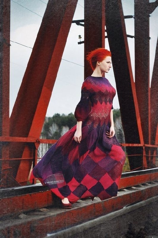 : 1. Интересно резко расклешается подол. Не прибавлением квадратов, а просто резким увеличением их. 2. Уголки по краю. Периодически меня спрашивают, а можно ли не вязать треугольники - можно! 3. Немножко негатива - платье душит. В жизни в таком ходить, скорее всего, будет тяжело. Тут либо нет ростка, либо он мал, ну... либо задумка автора. Кстати, если знаете, кто автор, или источник, напишите, я укажу.
