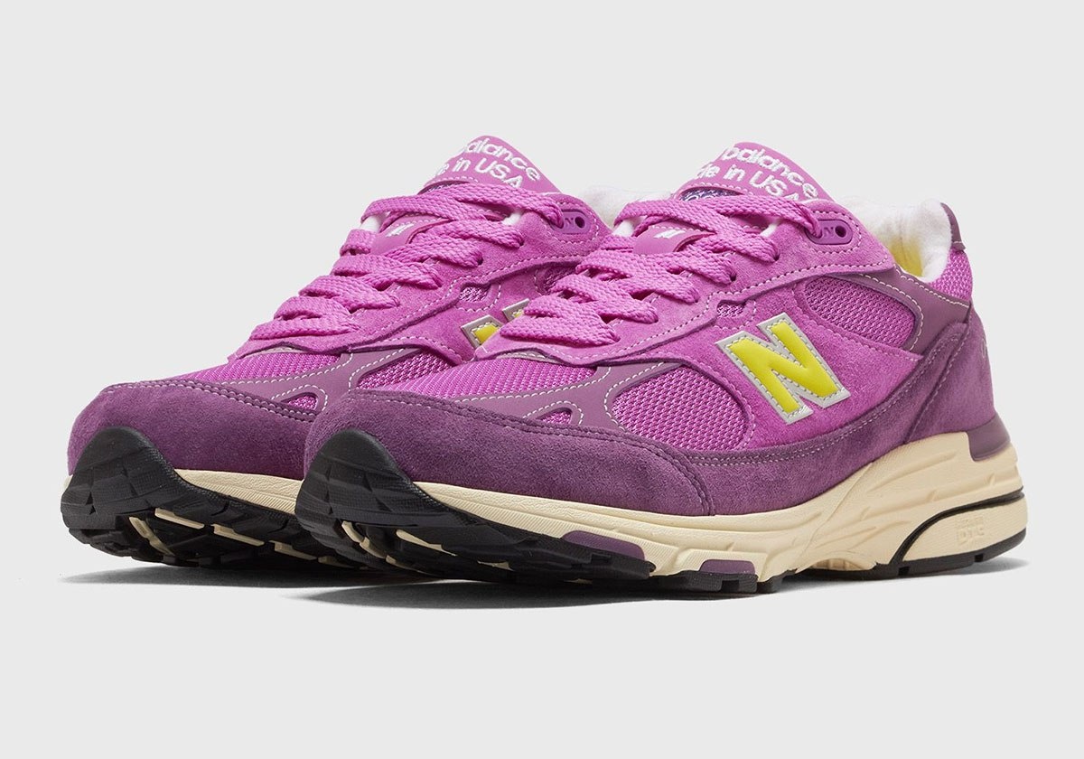 Коллекция New Balance Made in USA пополнилась моделью 993 «Пассифлора», релиз которой намечен на 12 марта. Расцветка выполнена в ярких тонах: нижние панели и подкладки — в оттенке Dusty Grape, основная часть верха — в цвете Passion Fruit, логотипы — в желтом Firefly. Белая стелька упрощает сочетание с белыми носками. Промежуточная подошва бежевая, подошва черная. Модель использует стандартную комбинацию замши, кожи и сетки, отличающуюся мягкостью. Это уже третья по счету модель в линейке на весну-лето 2026.