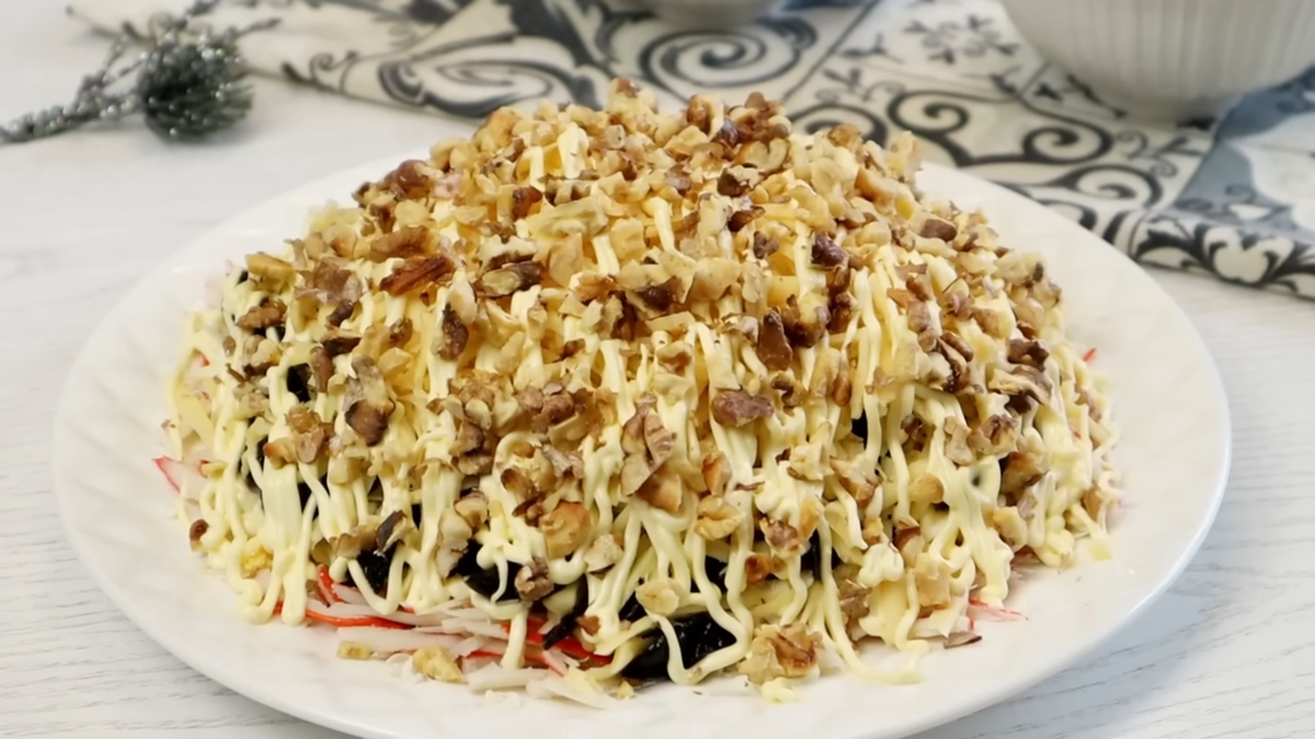 Вы когда-нибудь задумывались, как из самых простых ингредиентов можно создать настоящий гастрономический шедевр? 🥰 Этот салат на 8 марта — яркий тому пример! Его особенность в том, что каждый слой гармонично дополняет предыдущий: яйца с мягкой текстурой, крабовые палочки с морской свежестью, чернослив с лёгкой сладостью, а сыр и грецкие орехи придают насыщенность и объём. Он отлично смотрится на праздничном столе, а маленькая кулинарная хитрость со сливочным маслом добавляет легкий сливочный вкус, который просто тает во рту. 1️⃣ Крабовые палочки Нарезаем тонкой соломкой или натираем на крупной тёрке. Выкладываем первым слоем, покрываем сеточкой майонеза. 2️⃣ Яйца Варёные яйца натереть на крупной тёрке. Выложить вторым слоем, слегка присыпать чёрным перцем и аккуратно покрыть майонезом. 3️⃣ Сливочное масло Подморозить масло в морозилке на несколько минут, затем натереть на мелкой тёрке прямо на салат. Это придаст нежность и сливочный вкус. 4️⃣ Чернослив Нарезаем соломкой, выкладываем