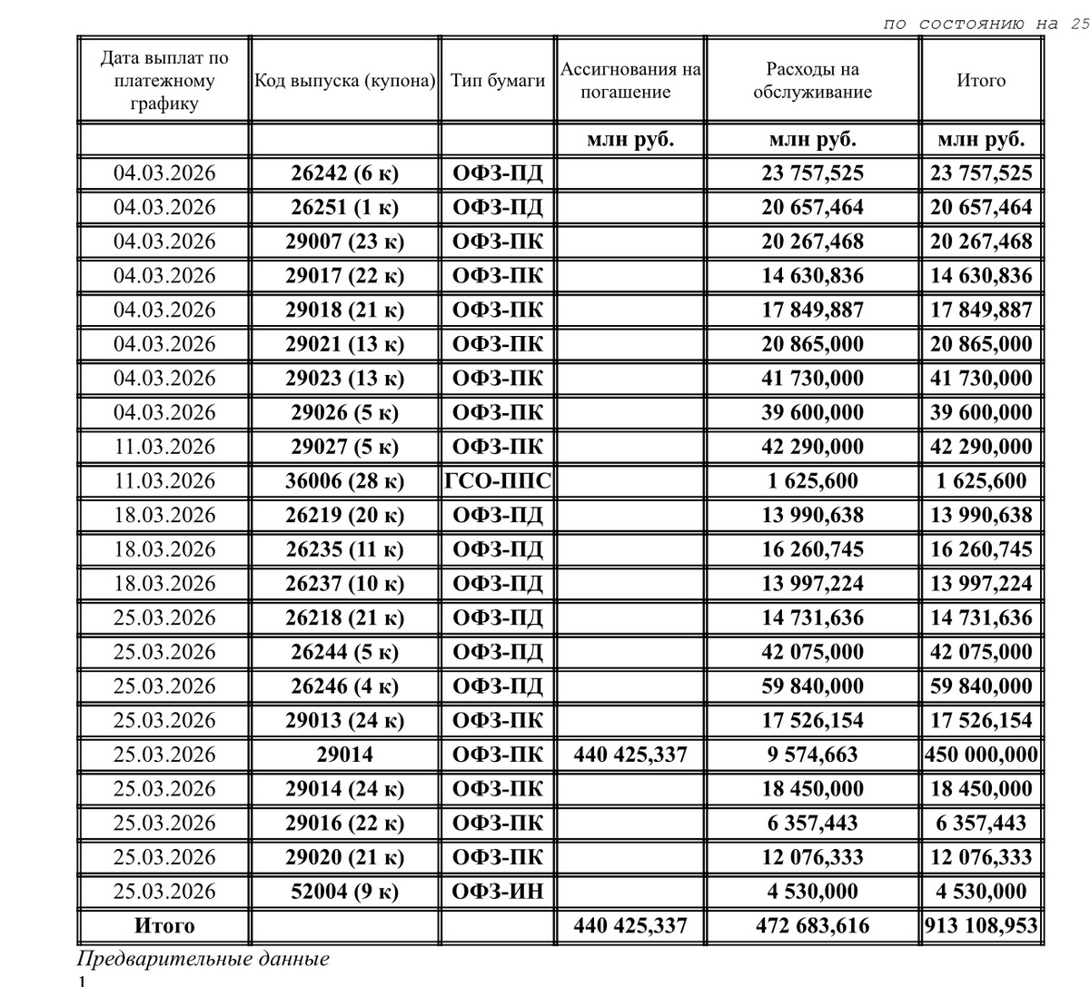 февраль: Минфин опубликовал данные о выплатах по ОФЗ в марте 2026 года. Платежи в марте резко возрастают. Сошлось сразу две причины: График по выплатам с начала года: Удачи и трезвого анализа в ваших инвестициях!!! P.S. Подписывайтесь на мой телеграмм-канал: https://t.me/Cervonets