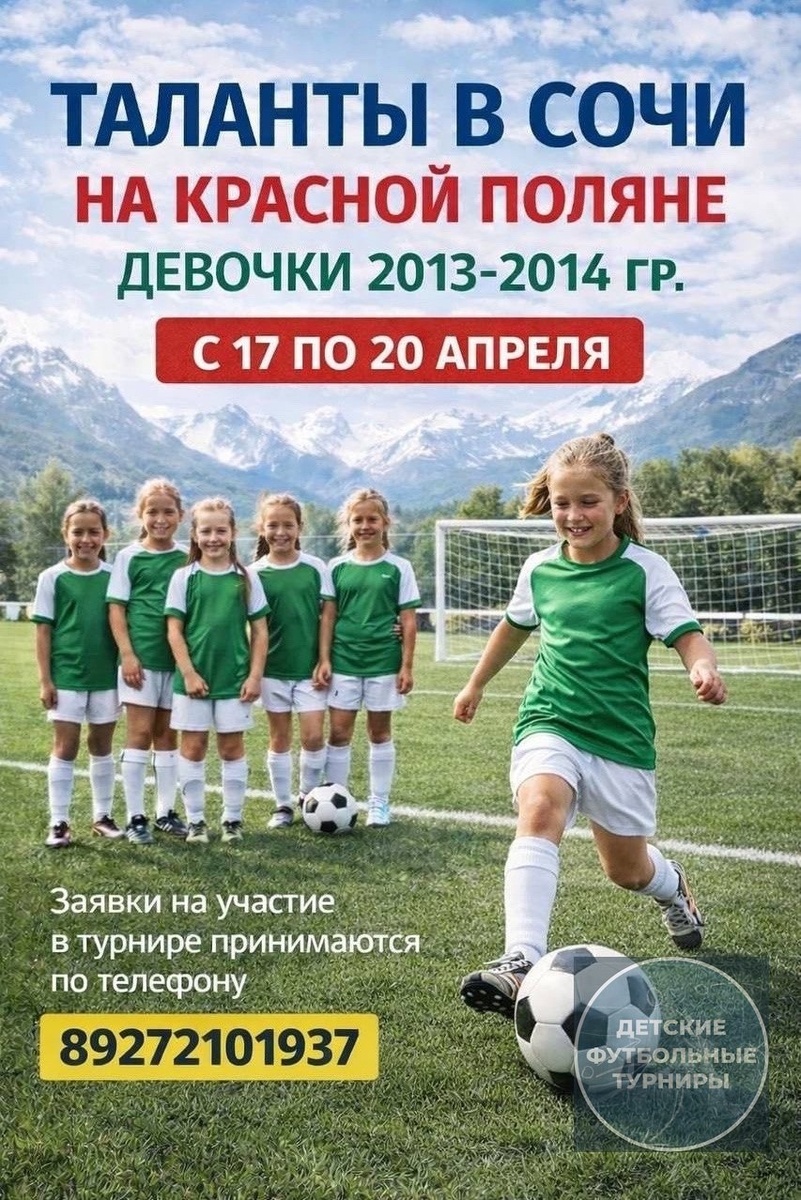 👧 Девочки 2013–2014 г.р. 📅 17–20 апреля Приглашаем команды принять участие в ярком весеннем турнире среди девочек в самом живописном уголке страны — в Сочи, на Красной Поляне! 🌿 Это не просто соревнования — это: ✨ красота Красной Поляны и величественные горы 🏔 свежий воздух и вдохновляющая атмосфера 🏨 отличный отель с комфортабельными номерами ⚽ высокий уровень организации и игровые дни на качественных полях 💚 вклад в развитие женского футбола и поддержку юных спортсменок Четыре дня футбола, эмоций, новых знакомств и настоящего спортивного роста! Создаём условия, в которых девочки не только соревнуются, но и вдохновляются, раскрывают свой потенциал и делают шаг вперёд в своём футбольном пути 💫 📲 Заявки принимаются по телефону: 8-927-210-19-37 --- #ФутбольныйТурнирАпрель2026 #ФутбольныйТурнирЮгРоссии2026 #ФутбольныйТурнирСочи2026 #ФутбольныйТурнирДевочкиСочи2013гр #ФутбольныйТурнирДевочкиСочи2014гр Источник: https://vk.com/wall-198894768_2338