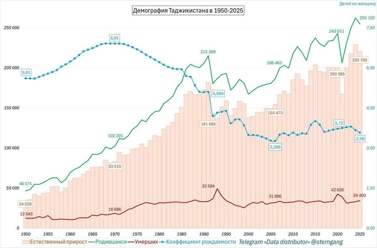 Демография Таджикистана по итогам 2025 года: • Количество рождений: снижение с 262.185 до 255.100 (−2.7 %) • Количество смертей: рост с 33.022 до 34.400 (+4.17 %) • Естественный прирост населения составил 220.700 человека против 229.163 в 2024 году • Коэффициент рождаемости (СКР) оценочно сократился с 3.67 до 3.58 детей на женщину Благодаря снижению смертности женщин, низким темпам урбанизации, сохранению социального уклада СКР таджиков в советскую эпоху не просто не снижался, он долгое время рос Если в 1950 году СКР был 5.61, то к 1970 г. достиг 6.91 ребёнка на женщину Спад начался лишь во второй половине 1980-х, при том был не слишком интенсивным На этом фоне количество родившихся живыми выросло с 46.5 тысяч до более чем 215.000 за 41 год Естественный прирост увеличился с 34.000 в 1950 году до 181.700 в 1991 году Последовавший за развалом СССР экономический кризис, а также разгоревшаяся гражданская война обернулись краткосрочным ростом смертности и снижением числа родившихся Мини