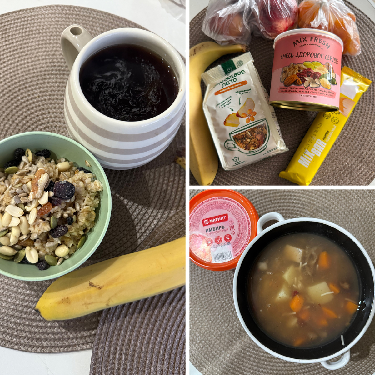 День 2. На завтрак была овсяная каша на воде с медом и орехами, кофе и банан.