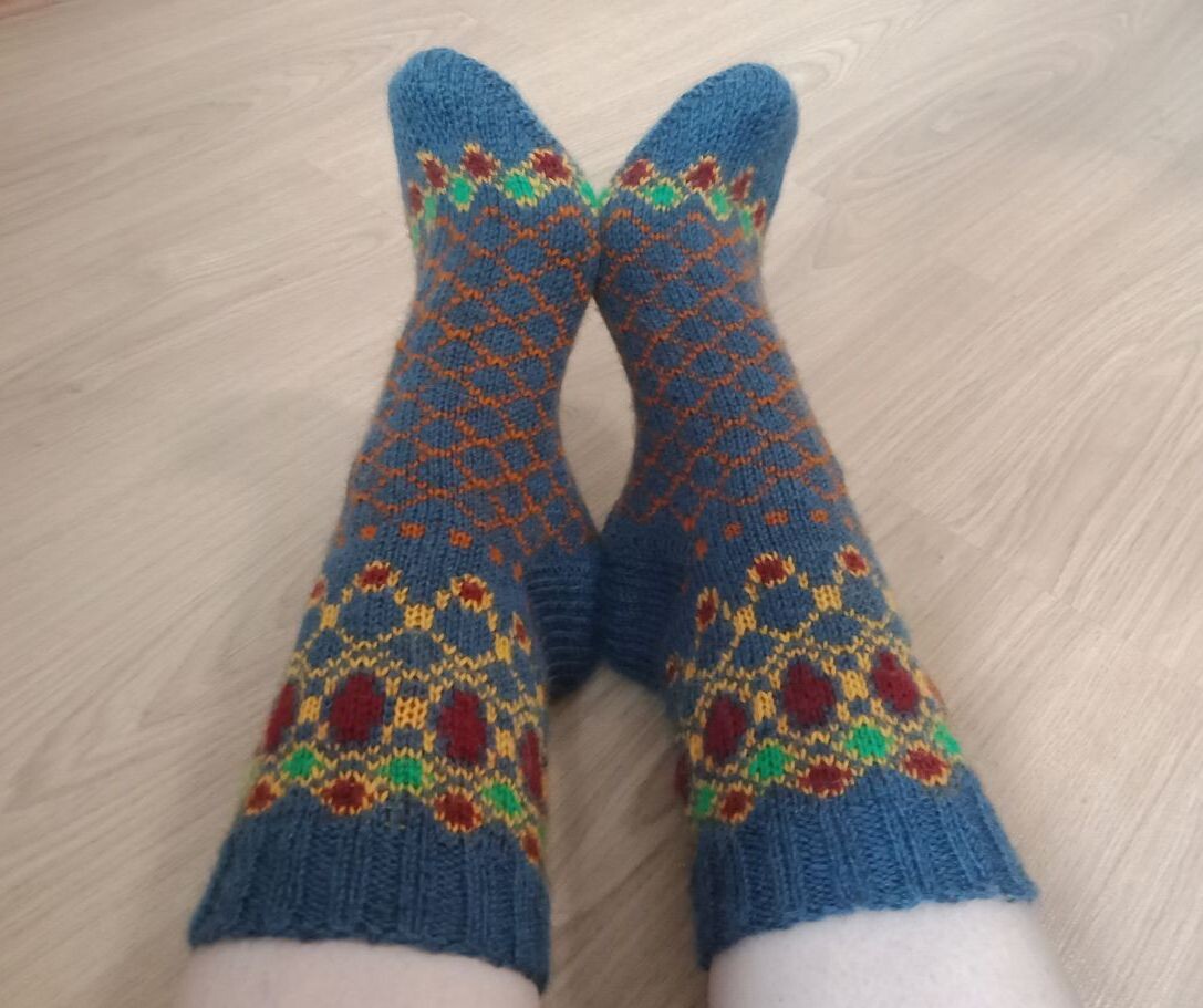 72 петли, спицы 2.0. Жаккард в три цвета в одном ряду на паголенке и возле мыска. На стопе жаккард в два цвета с доп.петлями. Доп.петли тянула по всей стопе, тренировала плотность, здесь всё по другому, не так, как в обычном жаккарде, нужно вязать поплотнее, чтобы полотно было ровнее и не напоминало стёганое одеяло с выпуклыми подушечками, но всё равно до идеала ещё о-о-очень далеко.Также тренировалась провязывать доп. петли и с левой, и с правой руки (правой рукой очень неудобно перекидывать нить на лицо). Раппорт узора 8 петель. Доп.петли делала через четыре основные петли, между двумя одинаковыми по цвету основными петлями.