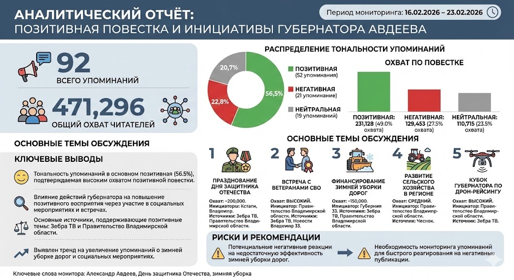 В период с 16.02.2026 по 23.02.2026 было зафиксировано 92 упоминания о губернаторе Александре Авдееве с общей аудиторией охвата 471,296 читателей. Тональность упоминаний была преимущественно позитивной (56.5%), что свидетельствует о положительном восприятии его действий иминициатив. Основные темы касались мероприятий, связанных с Днём