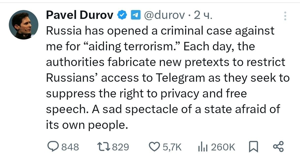 : Россия возбудила против меня уголовное дело за «пособничество терроризму». Каждый день власти придумывают новые предлоги для ограничения доступа россиян к Telegram, стремясь подавить право на неприкосновенность частной жизни и свободу слова. Печальное зрелище государства, боящегося своего собственного народа. Мда.. Похоже ситуация ещё хуже чем казалась. Чтобы не «потеряться», подпишитесь на наш канал в Мах 🔘🔘🔘Подписывайтесь!🔘🔘🔘 Подписаться на канал | 📲 MAX Мы в ВКонтакте