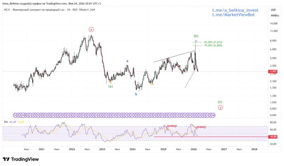 Газ: погодная премия уходит Снижение по газу— фактор холода постепенно отрабатывается. Основной драйвер роста в феврале недель — погодная премия (арктические холода в США). 🔹Сейчас рынок начинает закладывать: • потепление и нормализацию температур, • снижение спроса на отопление, • переход к межсезонью. 🔹 В межсезонье спрос традиционно падает — рынок фокусируется уже не на погоде, а на: • уровне запасов, • динамике экспорта СПГ, • балансе добычи. 🔹 Запасы (EIA) По данным EIA: • сезонные отбора прошли пик, • темпы снижения запасов замедляются, • уровень хранилищ остаётся выше критических отметок, • дефицита газа на конец сезона не формируется. 🔹 Дополнительно: • после резкого роста рынок был перегрет, • прошла фиксация прибыли, • усилились технические продажи. ‼️ Технически Движение вниз продолжается. Структура остаётся нисходящей — текущие отскоки носят коррекционный характер. в видео обсудили движение на Недельном, Дневном ТФ, часовики и младшие степени на 15-мин. ‼️ Вы