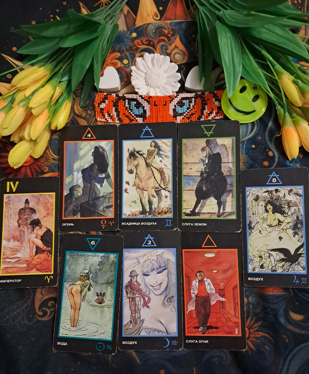 Этот расклад на колоде Манара показывает очень живую, но противоречивую картину его чувств к вам прямо сейчас. Он явно испытывает сильный интерес, но его разум и эмоции находятся в борьбе, создавая внутренний конфликт. Давайте разберем каждую карту, чтобы понять, что у него в душе.