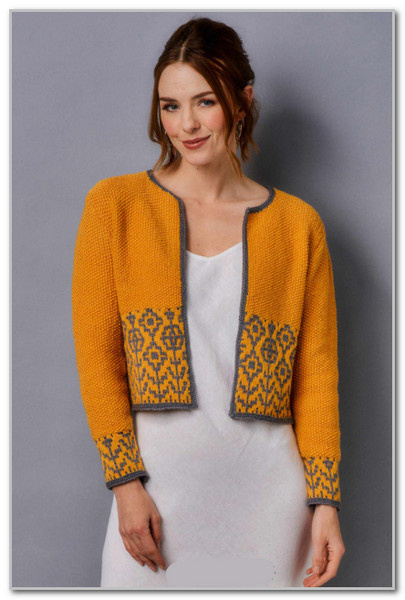Вам потребуется: пряжа Yarnsmiths Merino DK (100% шерсть мериноса; 110 м/50 г) - 400 (450:550:600:650:700:750:850:900) г горчично-желтого цвета, 100 (100:150:150:150:150:150:200:200) г серого цвета; спицы 3,5 мм и 4 мм, держатели петель (булавки для вязания).