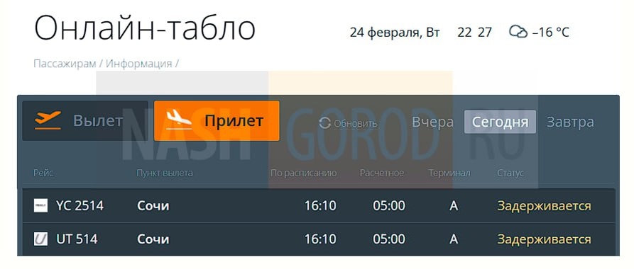 24 февраля борт авиакомпании «Ямал» выполнял рейс YC-89 Новый Уренгой — Домодедово. Сразу после вылета экипаж сообщил о нестандартной работе механизации крыла и принял решение уйти на запасной аэродром в Тюмень. В 20:20 самолёт благополучно приземлился в Рощино. Тем временем рейсы YC2514 и UT514 Сочи-Тюмень все ещё не вылетели в нашу сторону. По предварительной информации, они должны были совершить посадку в Тюмени в 21:05. Сейчас расчетное время прибытия перенесли на 05:00.