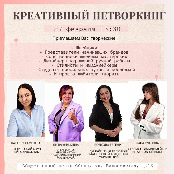 : «Коллаборации и вдохновение в мире моды» 💃 ❗ Вы готовы окунуться в мир творческих союзов и вдохновения? Тогда спешите присоединиться к уникальному мероприятию, которое откроет перед вами двери к новым возможностям и успешным проектам! 📆 Дата и время события: 27 февраля, 13:30. ⎯⎯⎯⎯⎯⎯⎯⎯⎯⎯ 📌 Программа мероприятия: - ✨ Узнайте всё о современных тенденциях коллабораций. А мы поможем раскрыть потенциал успешного сотрудничества и поделимся, как создавать совместные проекты, вдохновляющие своим результатом! - 👗 Уникальная презентация от обладательницы швейной мастерской, Евгении Елисеевой, раскрывающая секрет её успеха в сотрудничестве с дизайнером украшений Евгенией Болховой. Вас ожидает увлекательная история о создании совместной коллекции и этапах её реализации. - 🧥 Стилист и fashion-эксперт Лана Уланова проведет презентацию на тему «Стиль как инструмент масштабирования эксперта». Она покажет, как создание индивидуального образа помогает развивать ваш бренд и укреплять вашу реп