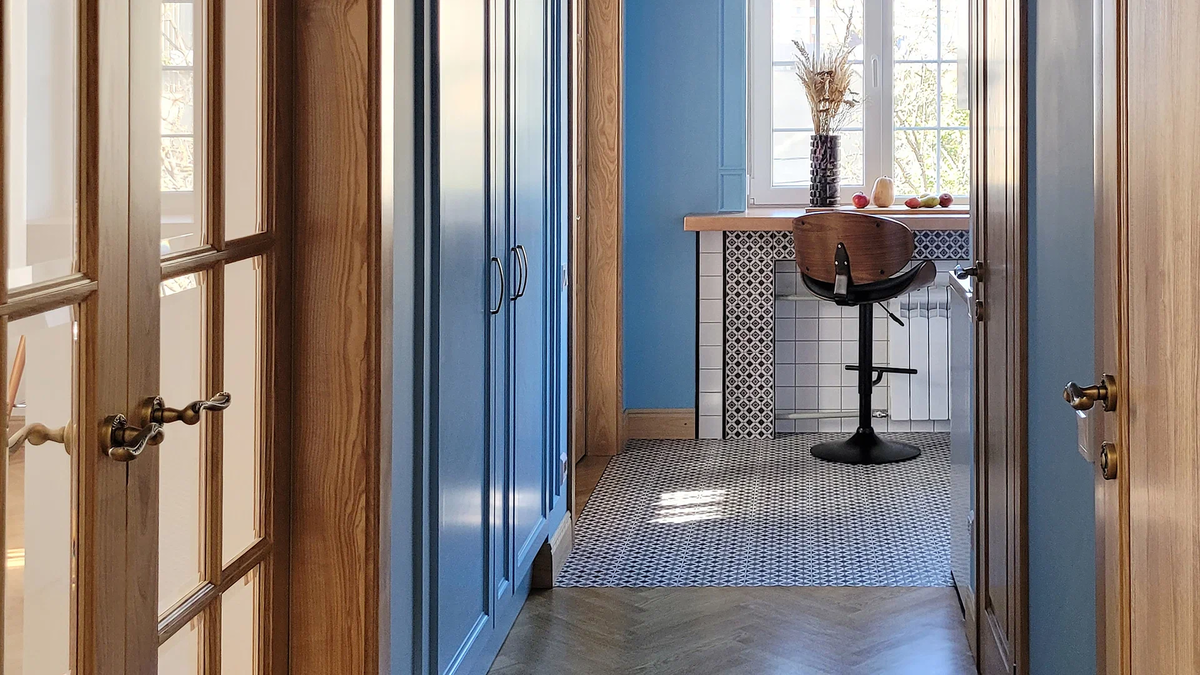Коридор. Стены и даже потолок здесь мы покрасили в цвет яркого летнего неба — на первый взгляд кажется, что оттенок слишком активный, но его уравновешивает тёплый тон паркета, двери из ясеня, а также нейтральный белый, серый и чёрный в других элементах обстановки.