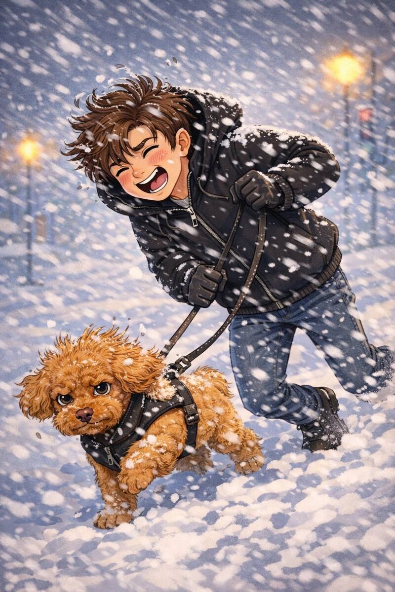 ❄️ Город заметает. Я — «класс, зима, атмосфера!» Джонни — «я маленькая собака, мне это не подходит». Пять минут прогулки: я смеюсь, он смотрит так, будто это я заказал метель. Кажется, кто-то очень ждёт весну 🌸🐶