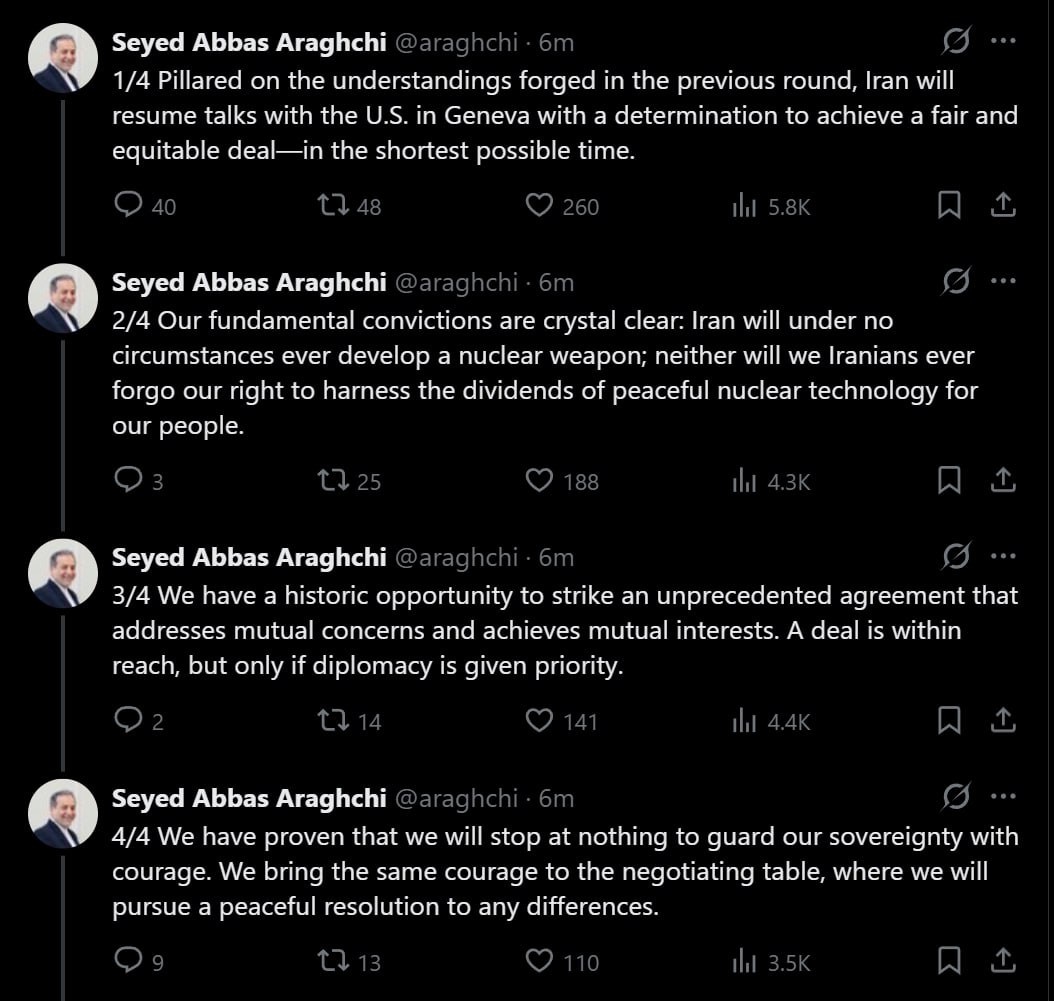 S. in Geneva ‘in the shortest possible time’ — FM Araghchi Tehran insists it ‘will never develop a nuclear weapon’ while defending its right to peaceful nuclear tech Diplomacy is within reach — but Iran will 'guard sovereignty with courage'