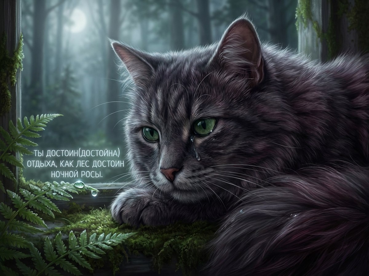 За окном медленно гаснет день, и всё, что сегодня тревожило, имеет право раствориться в наступающей ночи. Ты сделал(а) достаточно; миру не нужно от тебя больше, чем ты смог(ла) дать сейчас. Посмотри на меня: я доверяю темноте, тихим звукам, мерцанию звёзд и спокойно передаю заботы прошедшему дню. И ты можешь так же — отпустить напряжение, простить себе усталость, положить голову на подушку, как на мягкое облако. Ночь бережно укроет тебя тишиной, а я буду рядом — хранить твой сон, пока завтра не принесёт новые, добрые возможности. Пусть каждый вздох становится мягче, мысли — тише, а сердце — спокойнее. Ты достоин(достойна) отдыха, как лес достоин ночной росы. Спи, зная: ты ценен(ценна) уже тем, что есть, и мир найдёт способ бережно ответить на твою доброту.