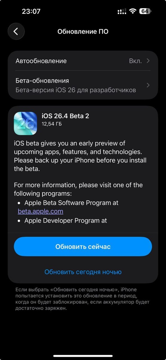 Apple распространила вторую бета-версию iOS 26.4 для зарегистрированных разработчиков. Сборка получила номер 23E5218e и уже доступна для установки по воздуху. Текущее обновление сосредоточено на исправлении обнаруженных ошибок и общем повышении стабильности операционной системы. О каких-либо заметных новых функциях или визуальных изменениях на данный момент не сообщается.